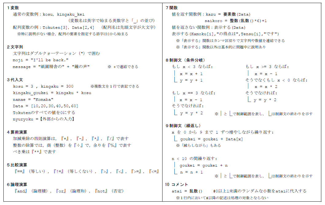 社会や身近な生活における具体的な活動事例の中で、プログラミングの基本である、入力と出力、代入、配列、繰り返し、条件分岐などの知識と手順・活用を、複数の小問で問う問題が出題されます。プログラム表記に関しては、大学入試センターの「情報サンプル問題」「情報Ⅰ試作問題」中にある日本語でのプログラム表記を使用します。※